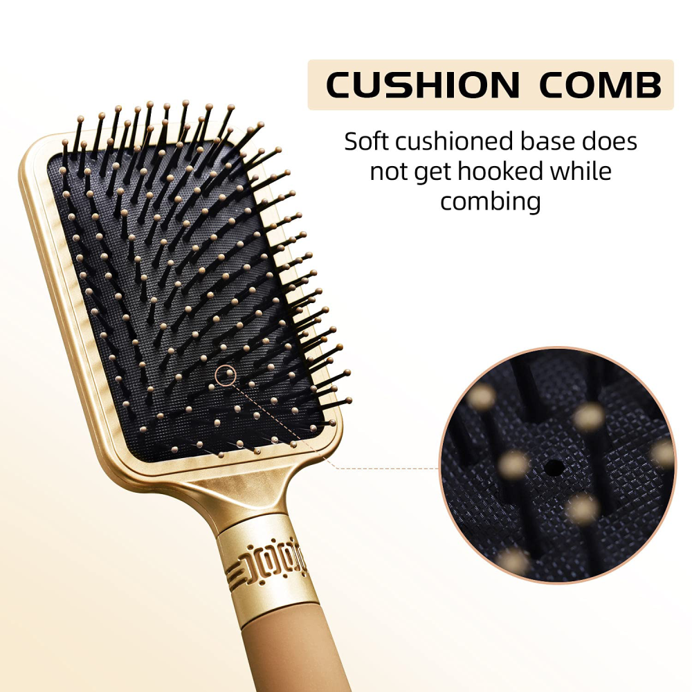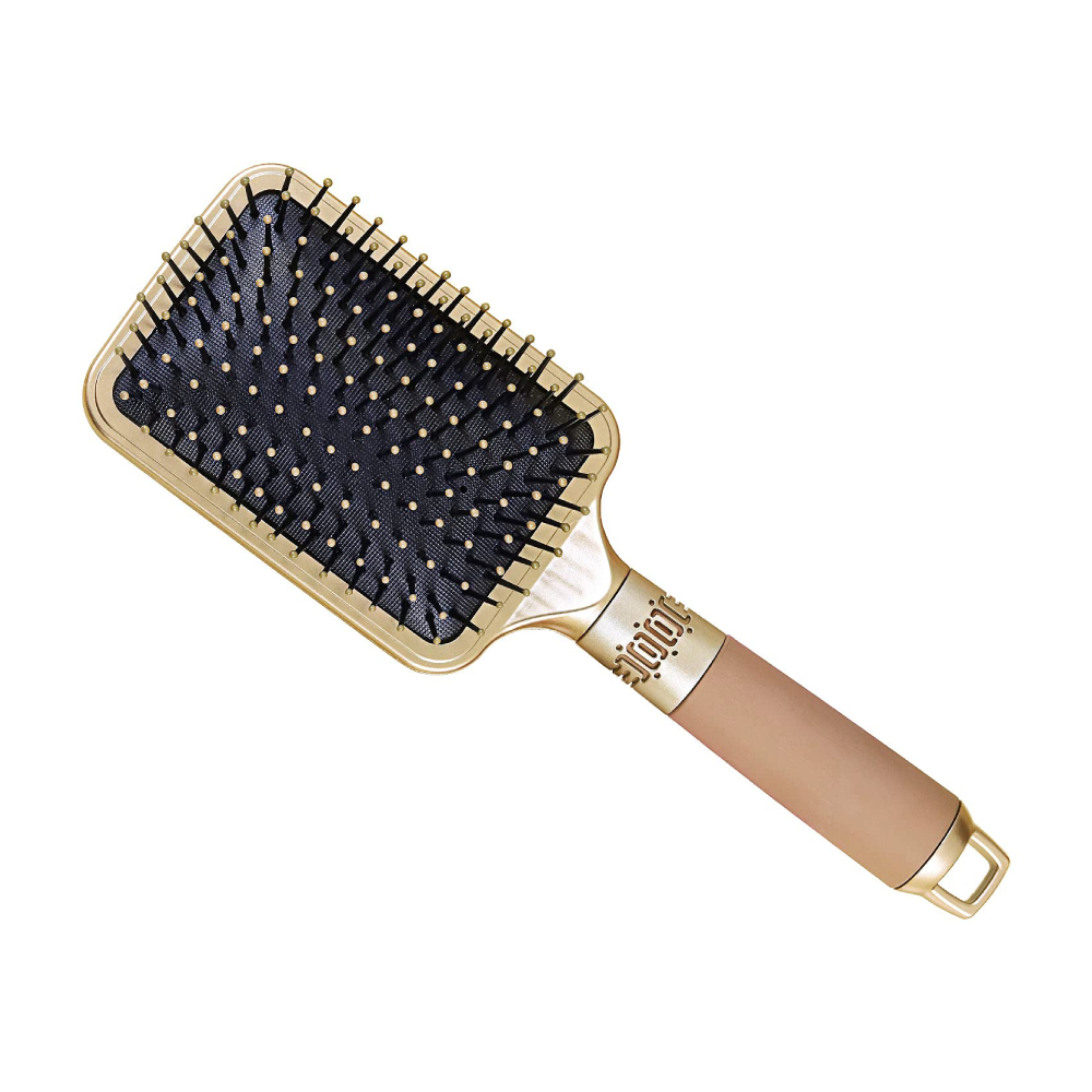 Uživajte u nježnom i efikasnom raščešljavanju uz jastučastu četku za kosu s mekanom bazom koja se prilagođava obliku vlasišta. Zahvaljujući gustim plastičnim zupcima sa zaobljenim vrhovima, četka nježno masira kožu glave bez grebanja ili čupanja kose. Zlatna drška s dekorativnim detaljima pruža elegantan izgled i udoban hvat tokom korištenja.