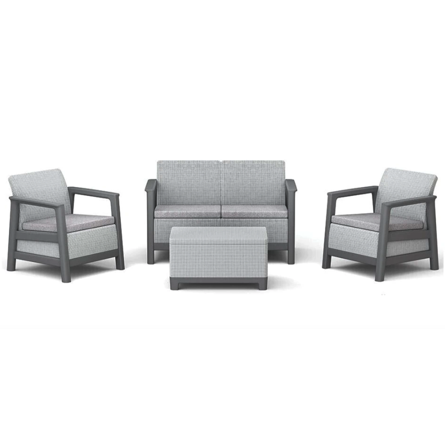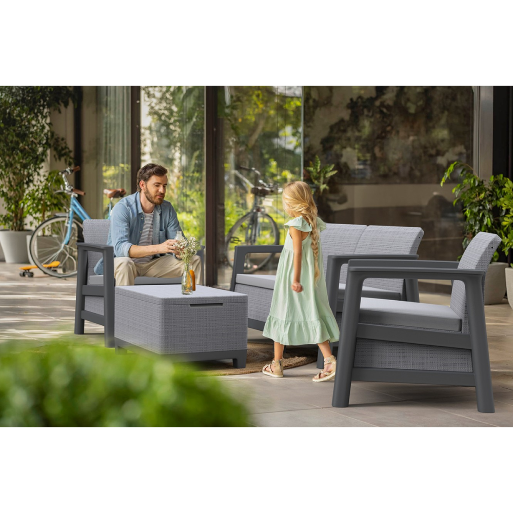 Komplet čine dvosjed, dvije fotelje i sto, što osigurava optimalan raspored sjedenja, dok sto nudi dodatnu praktičnost — u njegovoj unutrašnjosti nalazi se prostor za odlaganje, idealan za jastuke, dekor, sitnice ili pribor. Izrađena od PVC materijala otpornog na vremenske uslove i UV zračenje, garnitura je dugotrajna, jednostavna za održavanje i laka za čišćenje. Montaža je brza zahvaljujući CLICK sistemu sklapanja bez šerafa, što omogućava jednostavno sastavljanje bez alata.