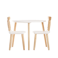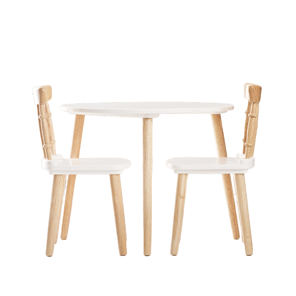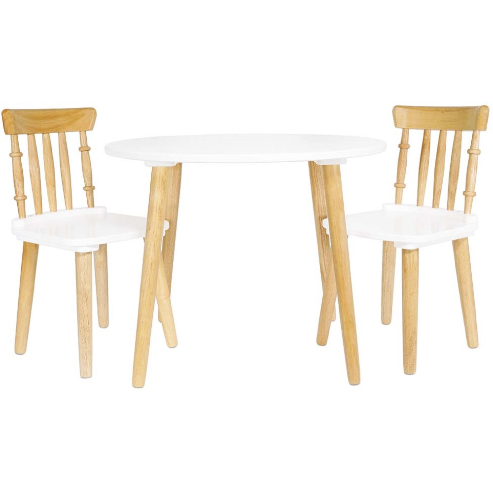 Set je dizajniran za djecu uzrasta 3 do 6 godina, a njegove dimenzije su savršene za svakodnevne aktivnosti poput crtanja, bojanja, slaganja slagalica ili uživanja u obroku. Moderan kontrast svježe bijele boje i prirodnog drveta daje setu univerzalnu estetiku, lako uklopivu u svaki interijer – od modernih do skandinavskih stilova.