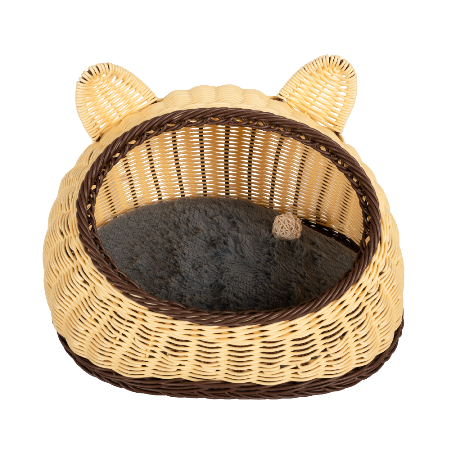 Poseban dodatak je mala viseća igračka, savršena za mačke i razigrane ljubimce. Dizajn s ušima i prirodnim pletenim izgledom čini kućicu i funkcionalnom i dekorativnom – lako se uklapa u svaki interijer.