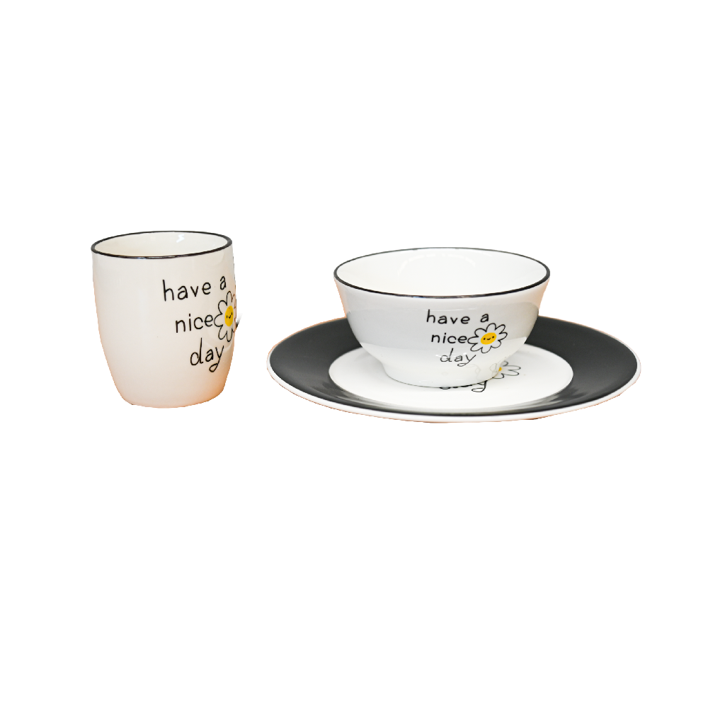 Ovaj set od tri komada savršen je izbor za svakodnevnu upotrebu ili posebne prilike. Sadrži plitki tanjir za glavna jela, duboki tanjir za supe i čorbe, te desertni tanjir za kolače i voće. Izrađen od visokokvalitetnog porcelana ili opalnog stakla, otporan je na ogrebotine, toplotu i hemijske uticaje.
