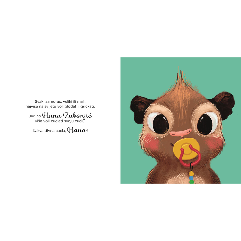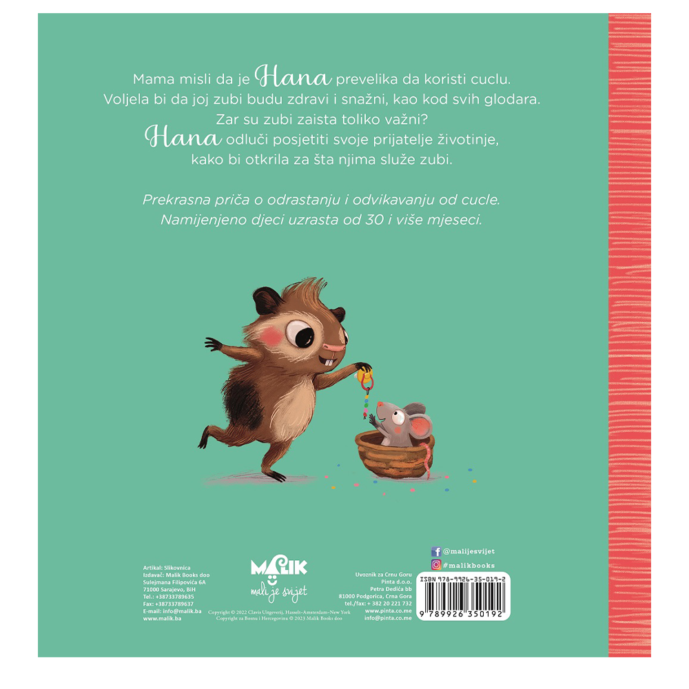Hanina cucla je edukativna slikovnica namijenjena djeci uzrasta od 30 mjeseci i više, koja kroz zanimljivu priču i ilustracije pomaže mališanima da se lakše odviknu od cucle. Hana, znatiželjna djevojčica, kreće u potragu za odgovorom – zašto su zubi važni? Upoznaje razne životinje i otkriva kako one koriste svoje zube, učeći usput o zdravlju, navikama i odrastanju.
