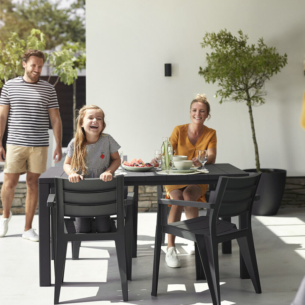 Ovaj prostrani vrtni sto predstavlja odlično rješenje za sve koji žele funkcionalan i pouzdan komad namještaja za terasu ili dvorište. Sa svojom velikom površinom od 147 cm dužine, pruža dovoljno mjesta za porodična druženja, obroke na otvorenom ili opuštene trenutke tokom toplih dana. Neutralna siva boja lako se uklapa u različite stilove vrtnog namještaja, što ga čini univerzalnim izborom za svaki eksterijer.
