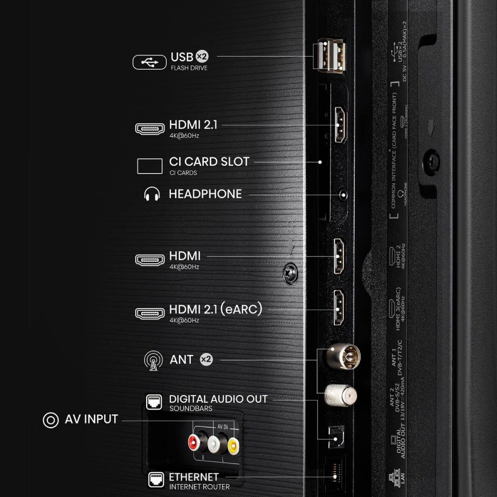 Hisense 58A6Q nudi bogate mogućnosti povezivanja — HDMI ×3, USB ×2, Wi‑Fi, SPDIF, optički izlaz, RF ulaz, CI+ slot, LAN RJ‑45 i izlaz za slušalice. Zahvaljujući 20W audio sistemu, zvuk je čist, jasan i dovoljno snažan za svakodnevnu upotrebu bez dodatnih uređaja.